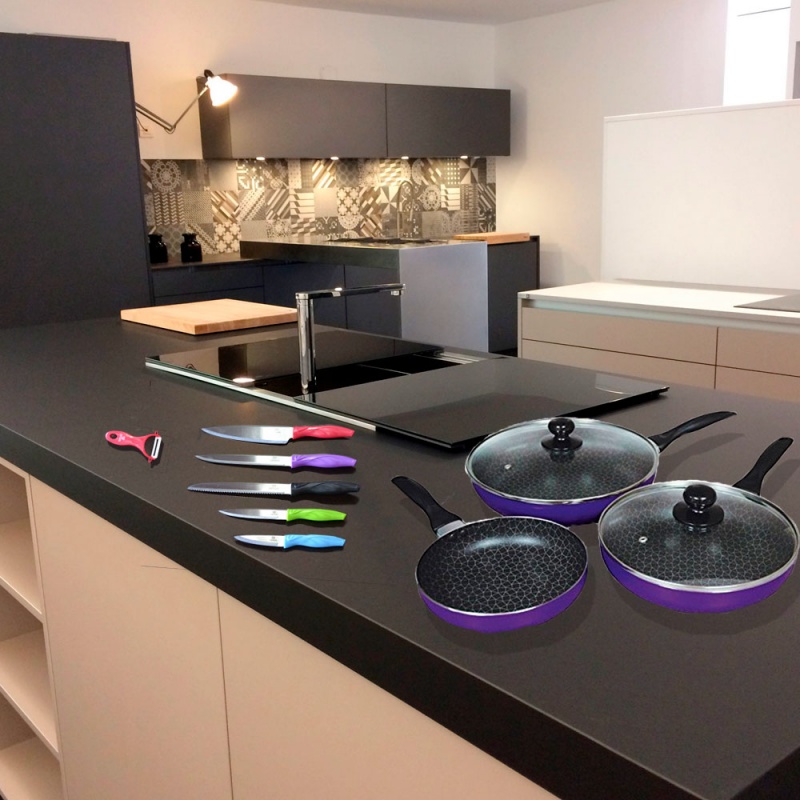 Incluye: 1 Sartén de 20cm, 1 sartén de 24cm, 1 sartén de 28cm, 1 tapa de cristal de 24cm, 1 tapa de cristal de 28cm.
